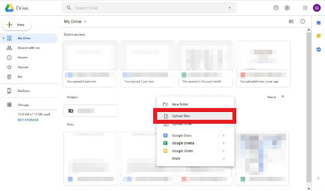 أولاً ، افتح متصفح الويب ، وقم بتسجيل الدخول إلى حساب جوجل الخاص بك وانتقل إلى جوجل درايف. بمجرد الوصول إلى هناك ، قم بتحميل مستند جديد عن طريق النقر بزر الماوس الأيمن على الواجهة الرئيسية وتحديد خيار التحميل من القائمة المنبثقة.